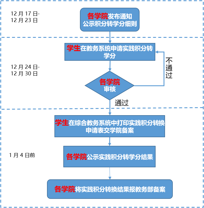 2.学生可于12月24日-12月30日登陆教务系统填报实践积分转学分申请。各学院认真审核学生的每一项申请转换内容,核对学生的实践积分类别与申请转学分课程是否相符。
