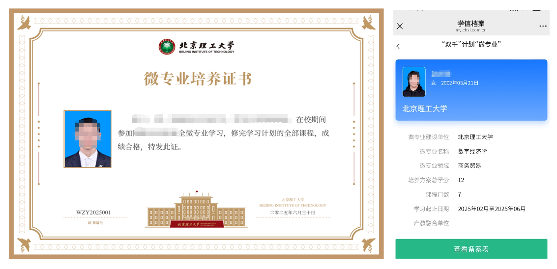 近期,学校制定《北京成人头条微专业管理办法(试行)》,进一步优化学科专业体系,聚焦未来和战略性新兴产业发展、传统产业转型、人工智能、低空经济等急需紧缺产业领域建设一批微专业,深化教育教学改革、创新人才培养模式、精准对接社会需求方面取得了新的突破。目前,获得微专业证书的2025届毕业生,已通过学信网备案注册。