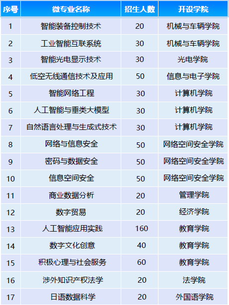 2025-2026学年第一学期,学校共16个微专业面向学生开放,报名开始时间为本周二(10月28日),欢迎感兴趣的同学关注教务部网站微专业报名通知。